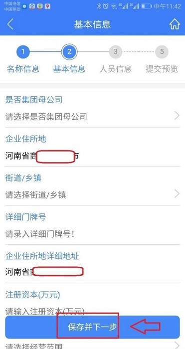 4.進入后,進行注冊公司企業(yè)基本信息的審核,輸入準確需要輸入的企業(yè)信息,點擊輸入進去,然后點擊下一步。