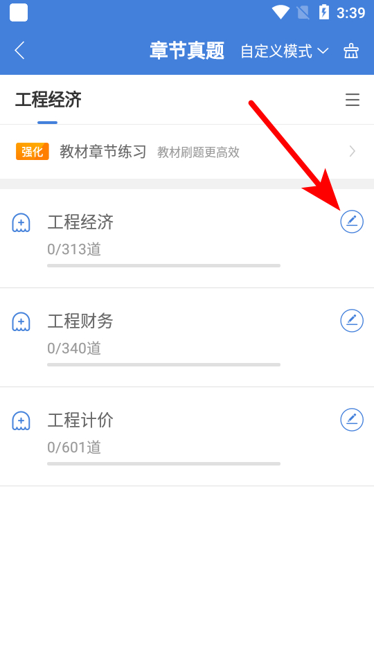 2、在章節(jié)真題選擇頁面,點擊目標章節(jié)旁的答題圖標,進入章節(jié)練習引導(dǎo)頁面。