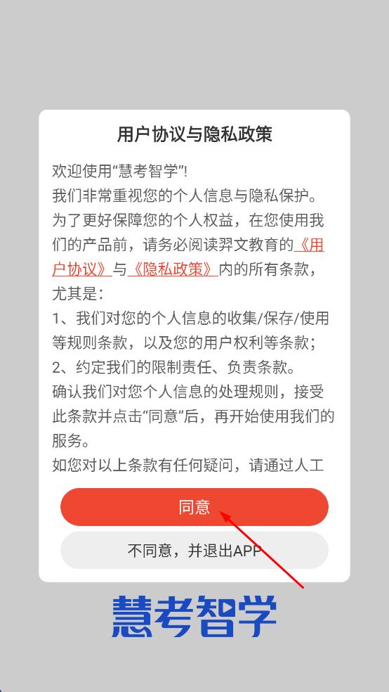1、打開慧考智學(xué)APP,會彈出用戶協(xié)議與隱私政策提示框,仔細(xì)閱讀相關(guān)內(nèi)容后,點(diǎn)擊“同意”按鈕,進(jìn)入APP主界面。