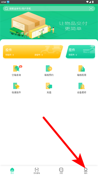 1、打開(kāi)速遞郵政APP,點(diǎn)擊右下角我的,進(jìn)入個(gè)人頁(yè)面。