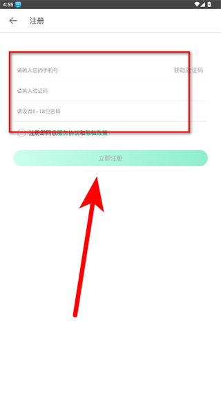 4、在注冊(cè)界面填寫(xiě)手機(jī)號(hào)碼、驗(yàn)證碼、設(shè)置密碼后,點(diǎn)擊立即注冊(cè),完成賬號(hào)注冊(cè)。