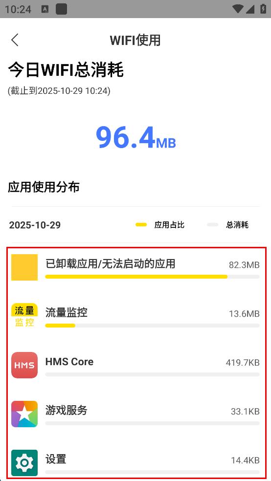 4、查看應(yīng)用使用分布情況,了解各應(yīng)用的WIFI消耗詳情。