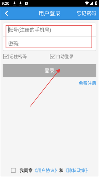 3、輸入注冊(cè)的手機(jī)號(hào)和對(duì)應(yīng)的密碼,勾選同意用戶協(xié)議和隱私政策,點(diǎn)擊登錄。