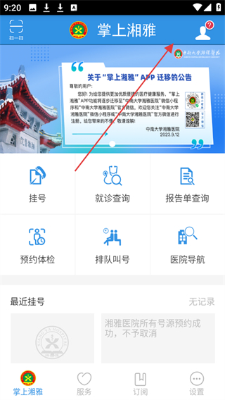 1、打開掌上湘雅app,點(diǎn)擊右上角的人像圖標(biāo),進(jìn)入個(gè)人中心。