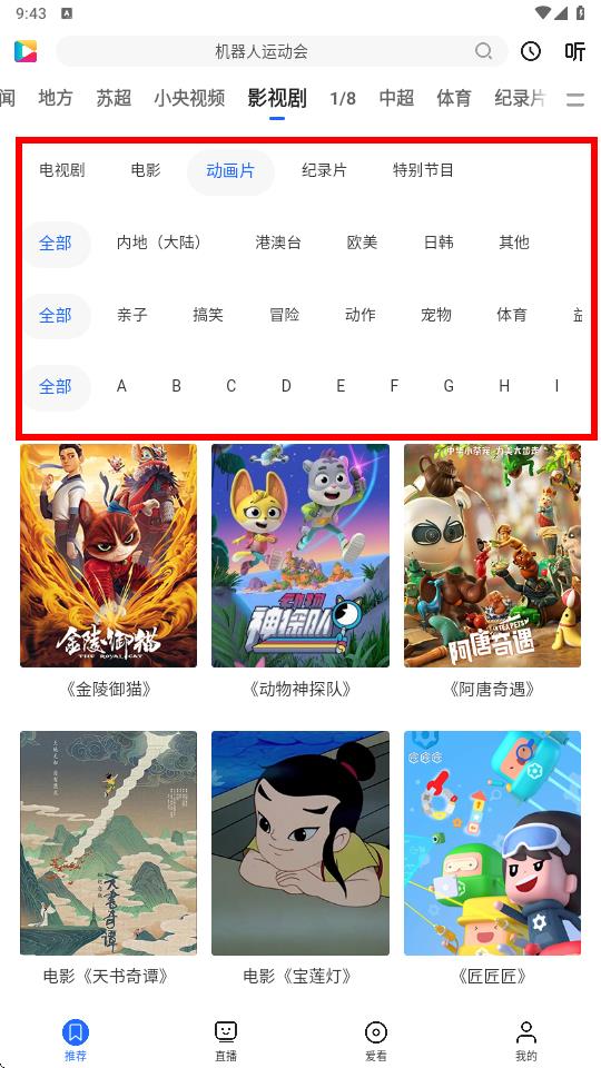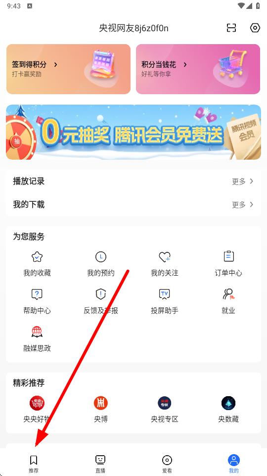 1、打開央視影音應(yīng)用,點(diǎn)擊底部導(dǎo)航欄中的推薦選項(xiàng),進(jìn)入推薦頁面。