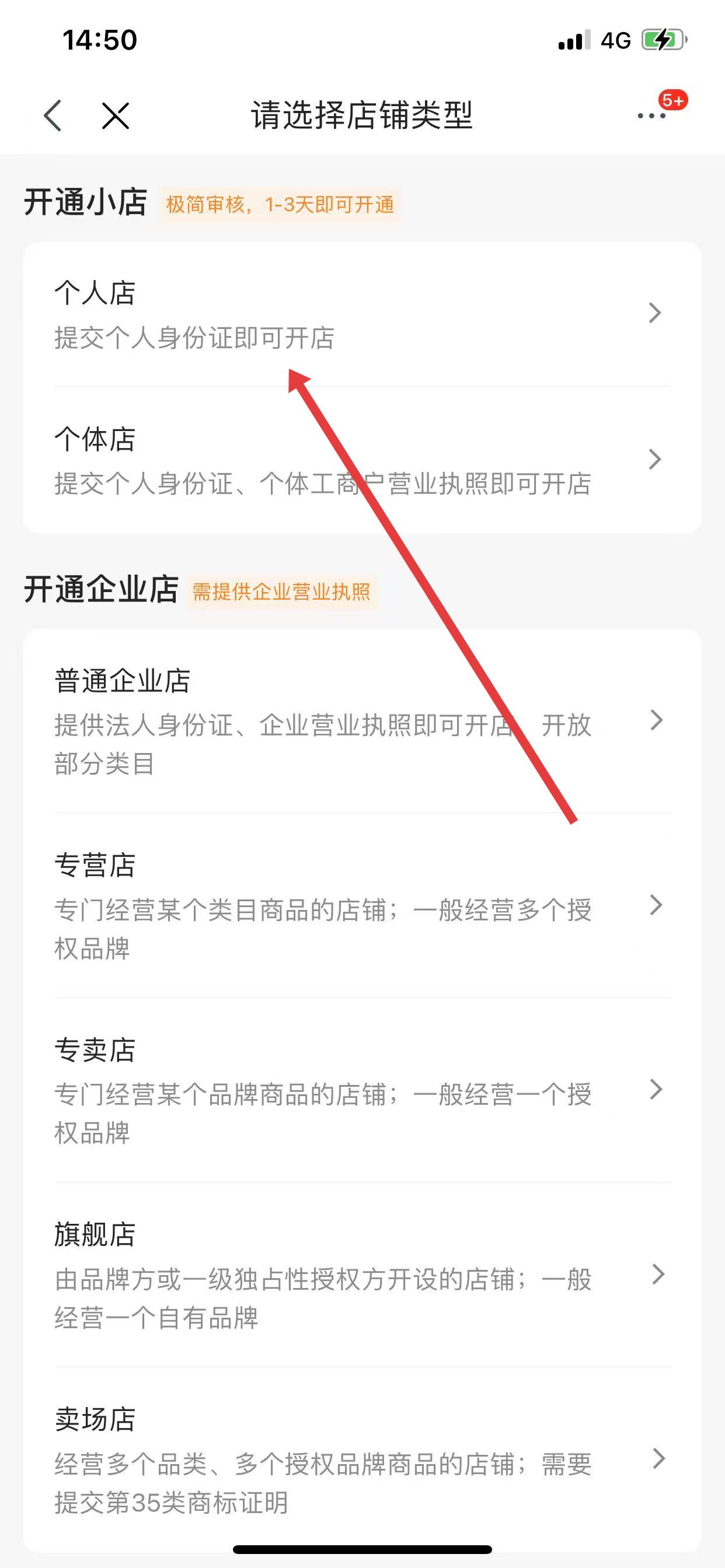 2、在請(qǐng)選擇店鋪類型界面,根據(jù)自身情況選,比如想開(kāi)個(gè)人店,就點(diǎn)擊個(gè)人店選項(xiàng)。
