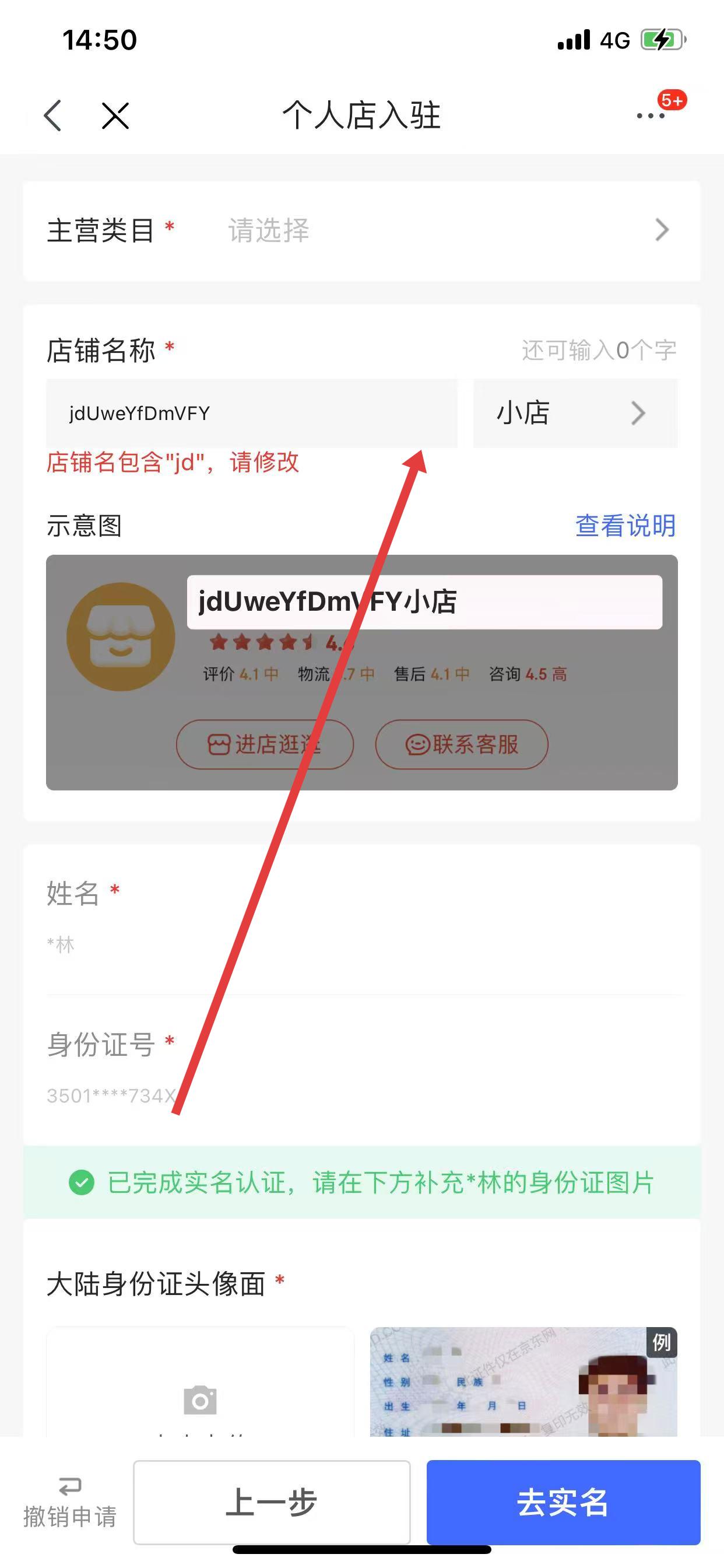 3、進(jìn)入個(gè)人店入駐頁(yè)面,按要求填主營(yíng)類目、店鋪名稱,完善姓名、身份證號(hào)等信息,上傳身份證圖片,完成后提交申請(qǐng)。