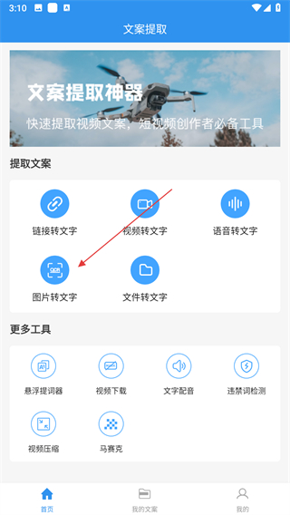 1、打開文案提取應用,點擊圖片轉(zhuǎn)文字選項,即可進入詳情頁。