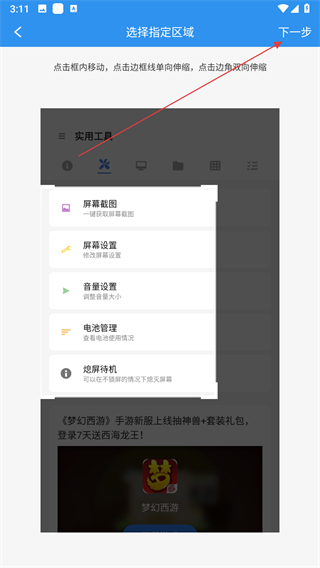 3、選擇好圖片后,進入選擇指定區(qū)域頁面,點擊右上角下一步。