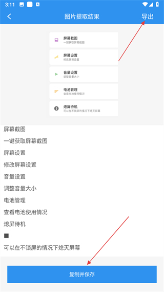 4、在圖片提取結果頁面,可點擊復制并保存或?qū)С霭粹o。