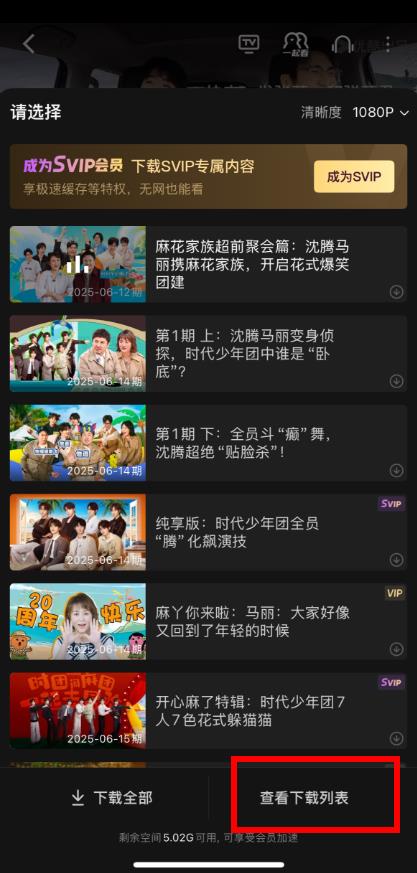 3、在彈出的界面中點(diǎn)擊查看下載列表,即可查看緩存進(jìn)度和管理下載任務(wù)。