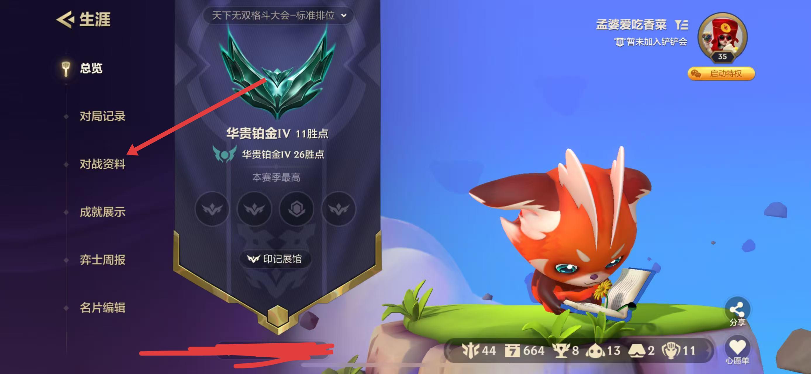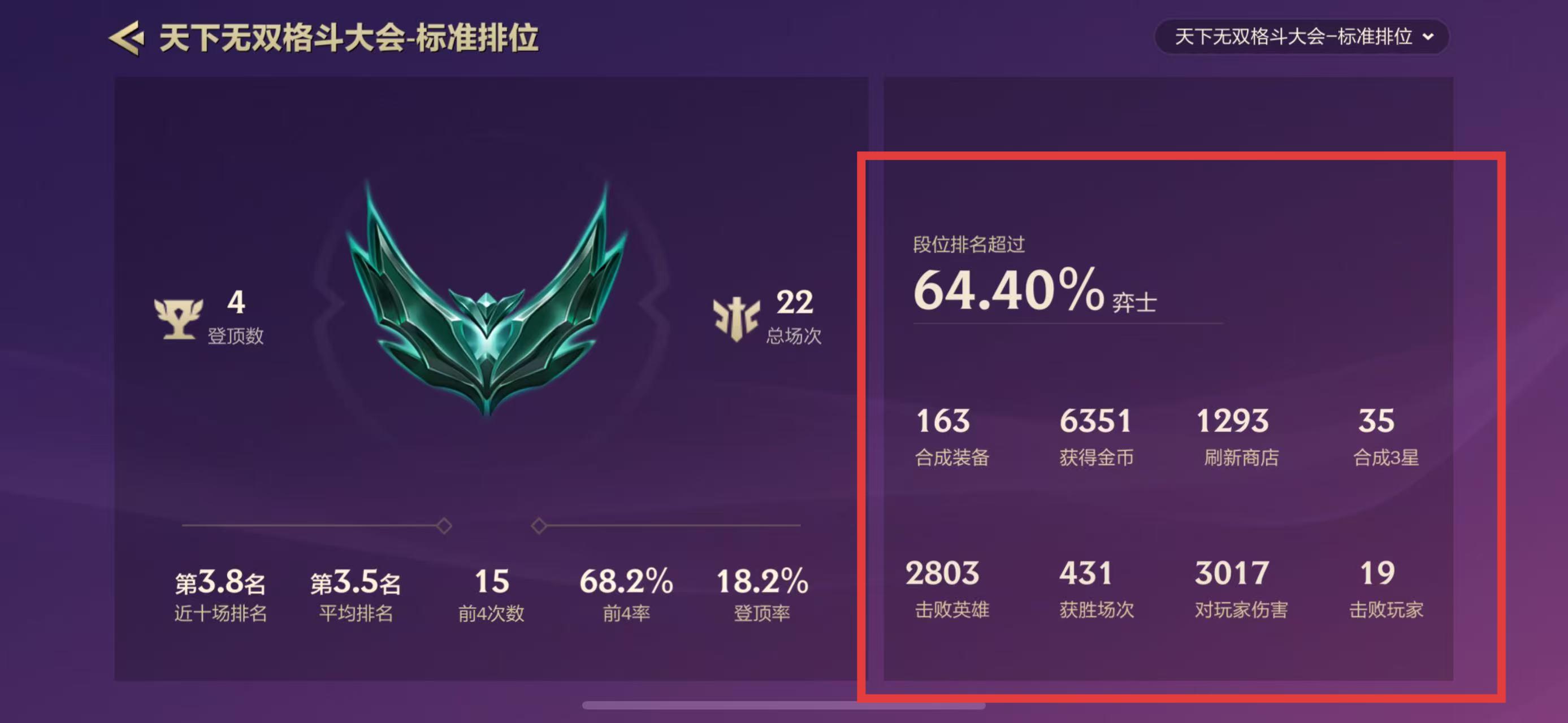 3、進(jìn)入對戰(zhàn)資料頁面后,就能看到對戰(zhàn)相關(guān)數(shù)據(jù)統(tǒng)計(jì),包括段位排名超越的玩家比例、合成裝備數(shù)量等信息。