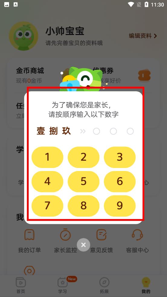 3、若出現(xiàn)家長身份驗(yàn)證彈窗,按照提示順序輸入對應(yīng)數(shù)字完成驗(yàn)證操作。