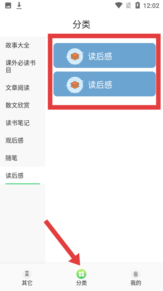 2、點(diǎn)擊底部導(dǎo)航欄中的分類(lèi)選項(xiàng),進(jìn)入分類(lèi)頁(yè)面,可以選擇如讀后感這類(lèi)自己感興趣的分類(lèi)板塊。