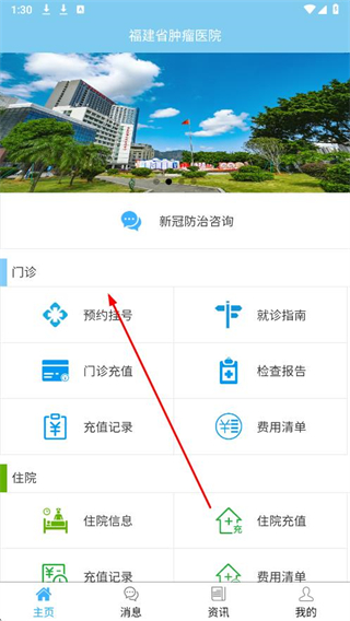 1、打開福建省腫瘤醫(yī)院APP,在主頁點(diǎn)擊預(yù)約掛號(hào)。