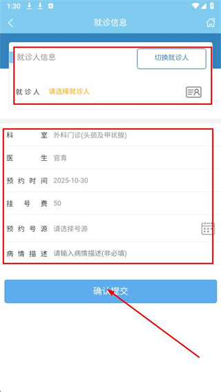5、選擇就診人,確認(rèn)信息,填寫病情描述后,點(diǎn)擊確認(rèn)提交。