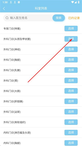 2、進(jìn)入科室列表頁面,選擇相應(yīng)科室,并點(diǎn)擊選擇。