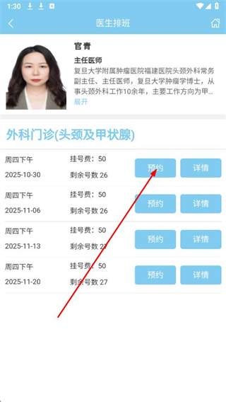4、進(jìn)入醫(yī)生排班頁面,選擇就診時(shí)間并點(diǎn)擊預(yù)約。