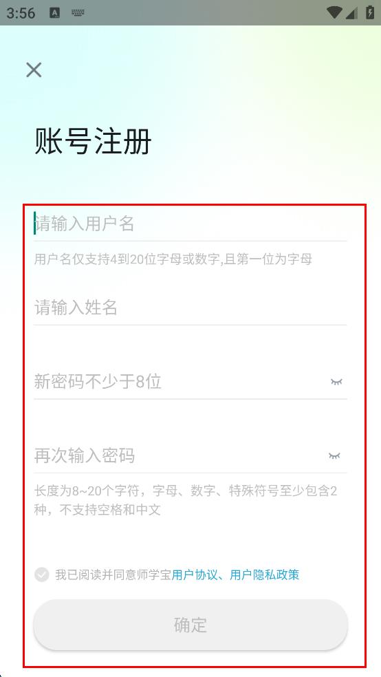 3、在賬號注冊頁面,依次輸入符合要求的用戶名、姓名,設(shè)置好不少于8位且符合字符要求的新密碼,并再次輸入密碼進(jìn)行確認(rèn),然后勾選同意師學(xué)寶用戶協(xié)議、用戶隱私政策。