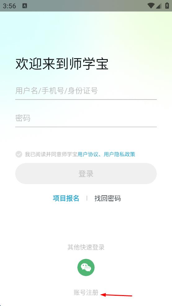 2、進(jìn)入歡迎來到師學(xué)寶的登錄界面,點擊“賬號注冊”,進(jìn)入賬號注冊頁面。