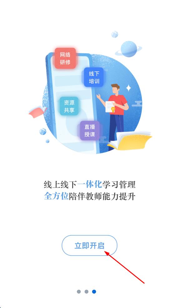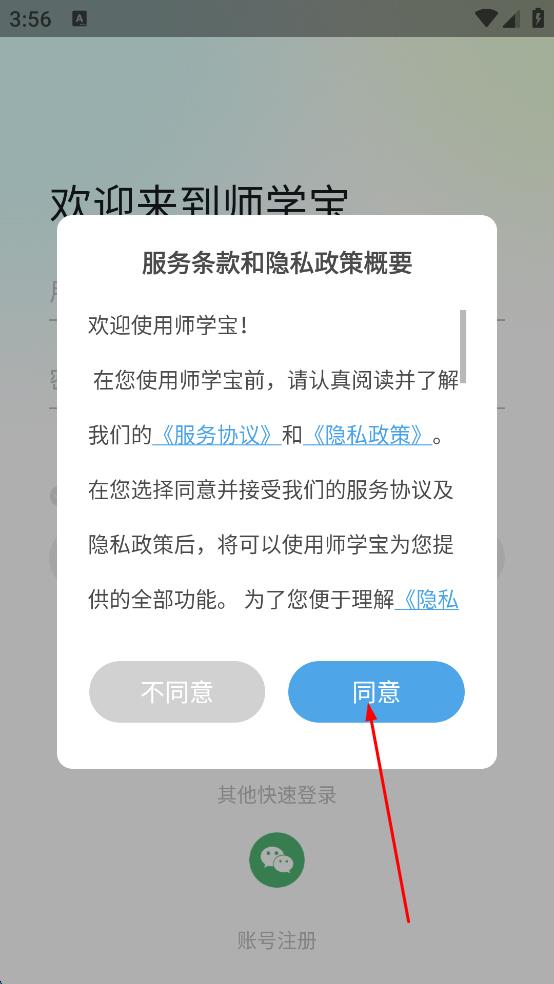 1、打開師學(xué)寶APP,在展示線上線下一體化學(xué)習(xí)管理的頁面,點擊“立即開啟”,進(jìn)入服務(wù)條款和隱私政策概要頁面后,點擊“同意”。