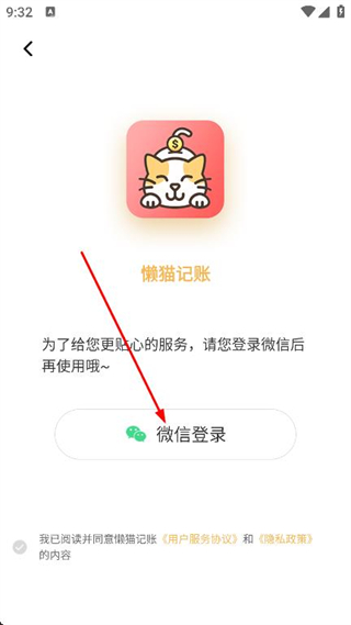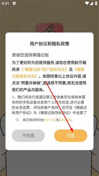 1、打開懶貓記賬,在彈出的隱私政策界面點(diǎn)擊同意。