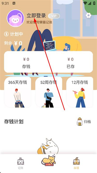 3、在存錢頁面,找到并點(diǎn)擊上方頭像區(qū)域的立即登錄。