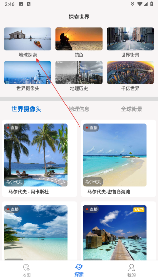 1、打開六寸互動地圖應(yīng)用,點(diǎn)擊底部導(dǎo)航欄的探索進(jìn)入探索世界界面,可選擇地球探索等探索項(xiàng)目。