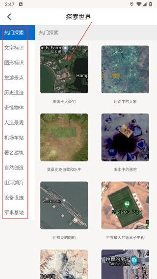 2、進(jìn)入地球探索后,左側(cè)是分類選項(xiàng),點(diǎn)擊分類查看對應(yīng)內(nèi)容,比如點(diǎn)擊熱門探索,右側(cè)會出現(xiàn)如美國十大豪宅等具體探索目標(biāo)。