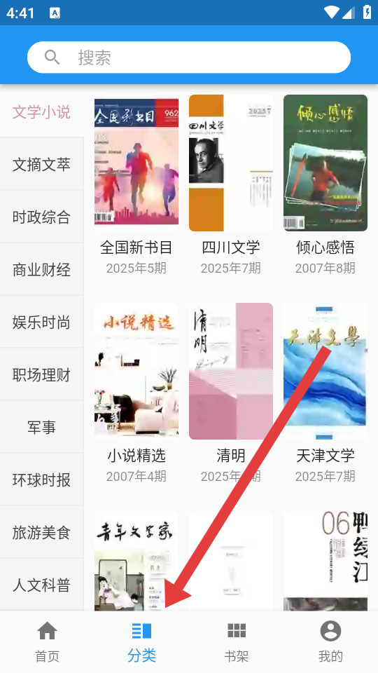 2、點擊底部導航欄的分類,進入分類頁面,查看文學小說、文摘文萃等細分板塊的刊物資源,按需選擇閱讀。
