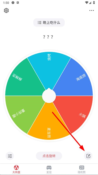 1、打開(kāi)隨機(jī)大轉(zhuǎn)盤app,進(jìn)入轉(zhuǎn)盤界面,點(diǎn)擊想要?jiǎng)h除選項(xiàng)對(duì)應(yīng)轉(zhuǎn)盤右下角的編輯圖標(biāo),進(jìn)入新建轉(zhuǎn)盤頁(yè)面。