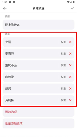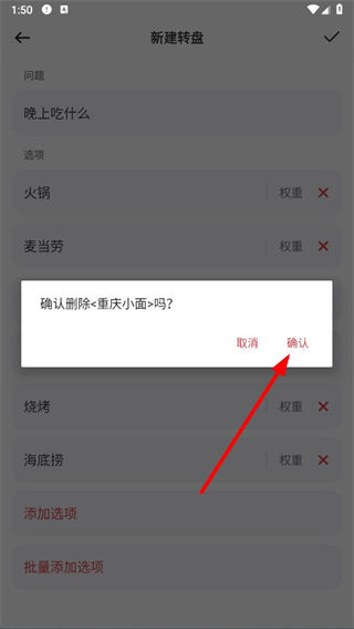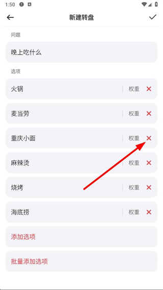 2、在新建轉(zhuǎn)盤頁(yè)面,找到需要?jiǎng)h除的轉(zhuǎn)盤信息選項(xiàng),比如重慶小面。