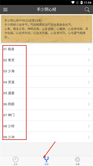 2、點(diǎn)擊經(jīng)絡(luò)選項(xiàng),可查看手少陰心經(jīng)等經(jīng)絡(luò)的具體穴位列表,如極泉、青靈、少海等穴位。