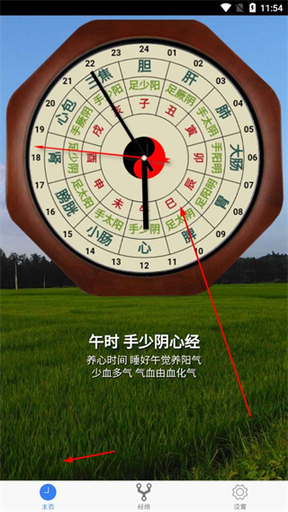 1、首頁的經(jīng)絡(luò)時(shí)鐘可顯示不同時(shí)辰對(duì)應(yīng)的經(jīng)絡(luò),如午時(shí)對(duì)應(yīng)手少陰心經(jīng),配有養(yǎng)心等養(yǎng)生知識(shí)說明。