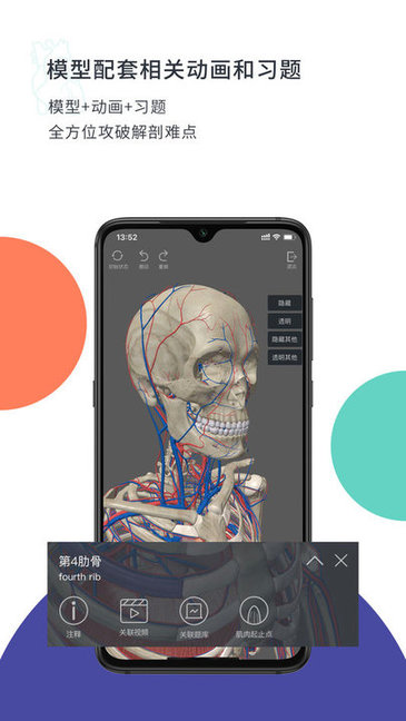 4000多個超高精度的3D人體模型,可360°觀察,任意縮放、隱藏、透明人體器官如骨骼及關(guān)節(jié),并配套專業(yè)的文字解釋、肌肉起止點,并且每個模型都配套了相關(guān)的動畫與習(xí)題。