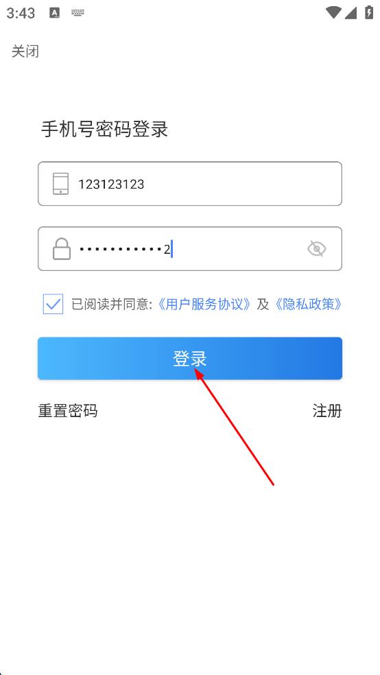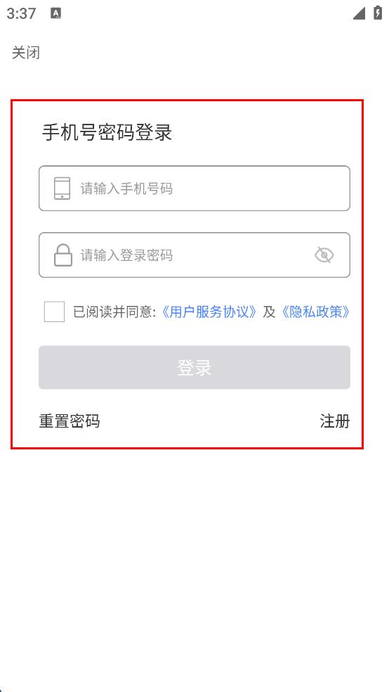 3、在個(gè)人相關(guān)頁(yè)面,進(jìn)入到手機(jī)號(hào)密碼登錄界面,輸入手機(jī)號(hào)碼和登錄密碼,勾選已閱讀并同意用戶服務(wù)協(xié)議及隱私政策。