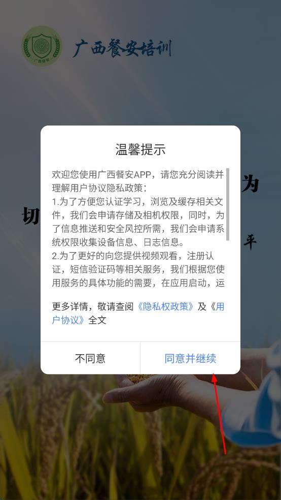 1、打開(kāi)廣西餐安App,彈出“溫馨提示”框,仔細(xì)閱讀后點(diǎn)擊“同意并繼續(xù)”,進(jìn)入到應(yīng)用主界面。