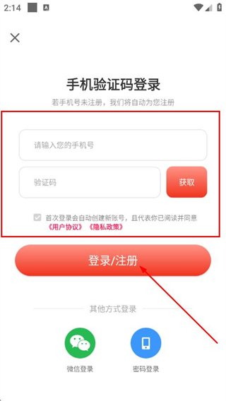 3、輸入手機(jī)號,獲取并輸入驗證碼,點擊登錄/注冊,完成賬號注冊。