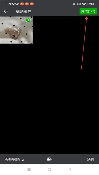 3、在視頻選擇的頁面內(nèi),選擇后點擊右上角完成的按鈕。
