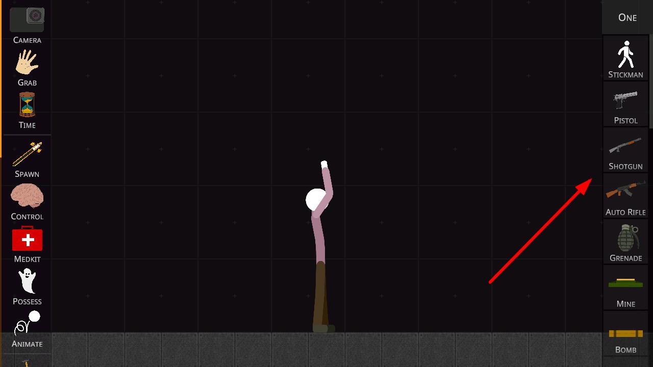 1、若想讓火柴人持有武器,點擊右側(cè)武器列表,如SHOTGUN等。就能給火柴人配備相應的武器。