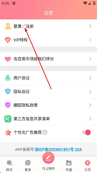 2、在設(shè)置頁面,找到并點擊上方登錄/注冊選項。