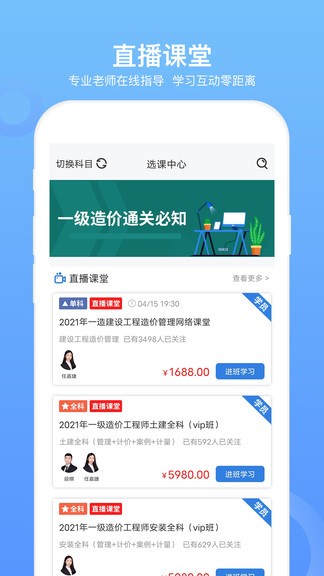一級(jí)造價(jià)工程題庫(kù)是一款用來(lái)幫助學(xué)習(xí)工程造價(jià)人群的app,軟件上有非常多的專(zhuān)業(yè)的課程可以進(jìn)行學(xué)習(xí),大量的題目和經(jīng)典的題型隨意使用,還有非常多的專(zhuān)業(yè)的教師在線直播教學(xué),幫助用戶能夠輕松的考過(guò),拿到想要的證書(shū),各種專(zhuān)業(yè)的學(xué)習(xí)方法能夠讓你的成績(jī)快速提高。