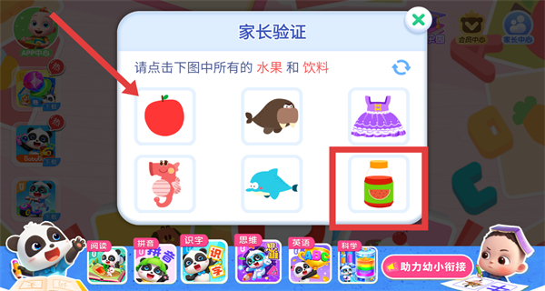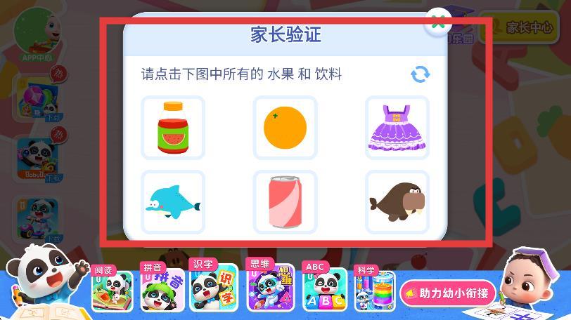 2、在家長驗證界面,點(diǎn)擊所有的水果如蘋果和飲料如西瓜汁圖標(biāo),完成驗證。