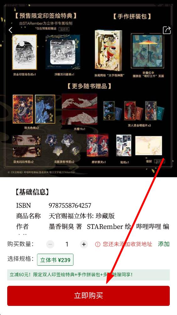 2、進(jìn)入書籍詳情頁面,查看書籍介紹、隨書贈(zèng)品等信息,確認(rèn)規(guī)格和購買數(shù)量后,點(diǎn)擊立即購買按鈕。