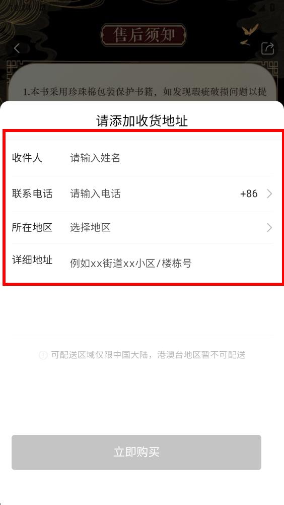 3、若未添加收貨地址,會(huì)彈出添加收貨地址界面,依次填寫收件人姓名、聯(lián)系電話、所在地區(qū)、詳細(xì)地址。