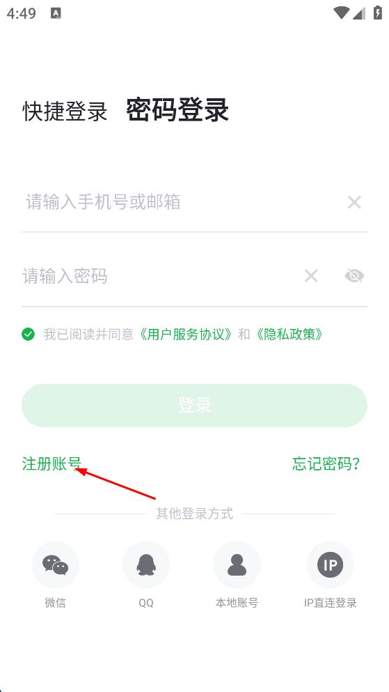 2、在密碼登錄頁面,點(diǎn)擊“注冊賬號”選項(xiàng)。