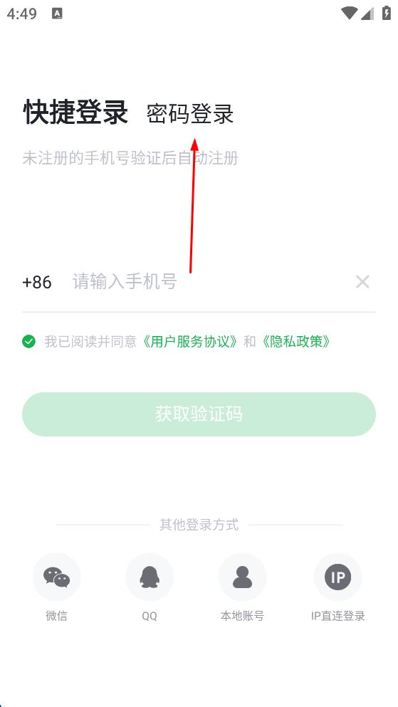 1、打開登錄軟件,在登錄頁面點(diǎn)擊“密碼登錄”選項(xiàng)。