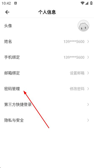 3、進(jìn)入個(gè)人信息頁面后,點(diǎn)擊上方密碼管理選項(xiàng)。