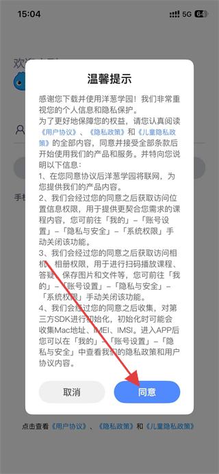 1、打開洋蔥學園APP,在溫馨提示彈窗中點擊同意。