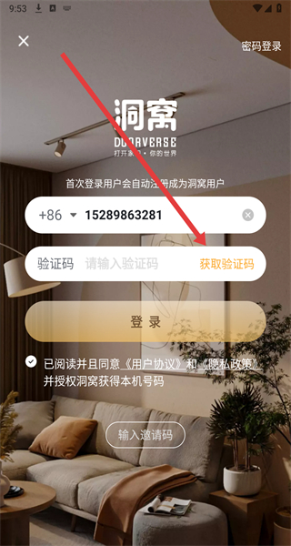 3、在登錄界面輸入手機(jī)號(hào)碼,點(diǎn)擊“獲取驗(yàn)證碼”。